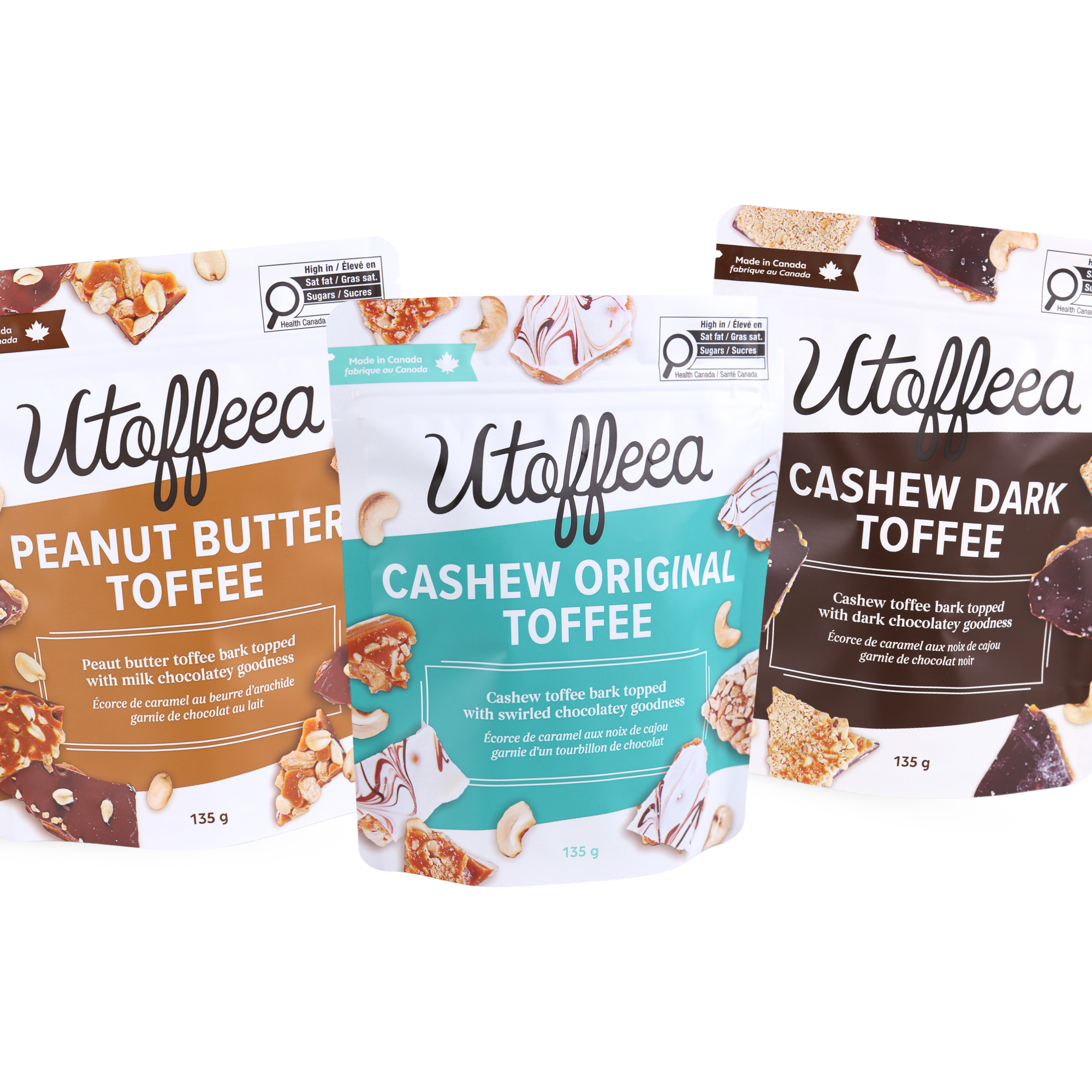 Each bag offers a delicious, handcrafted treat. The Cashew Original blends buttery toffee, crunchy cashews, finished with swirled chocolate. The Cashew Dark adds a rich layer of dark chocolate to this classic combo, perfect for those who love deeper flavours. And the Peanut Butter Utoffeea combines creamy peanut butter with our signature toffee, layered on roasted peanuts and topped with milk chocolatey goodness for a sweet and savoury twist.