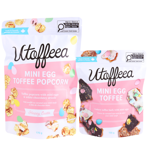 • Mini Egg Utoffeea (135g bag) – Our signature handcrafted toffee layered with rich chocolate and topped with crushed mini eggs for a festive twist.